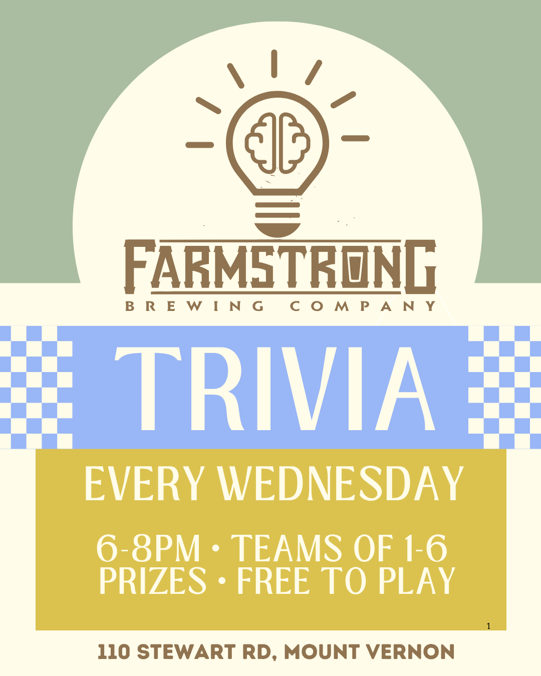 6pm-8pm, free to play, teams of 1-6 people, prizes every round and prizes for the top 3 scoring teams! Make sure to get here early to grab a table and some delicious food from Rooted Kitchen!